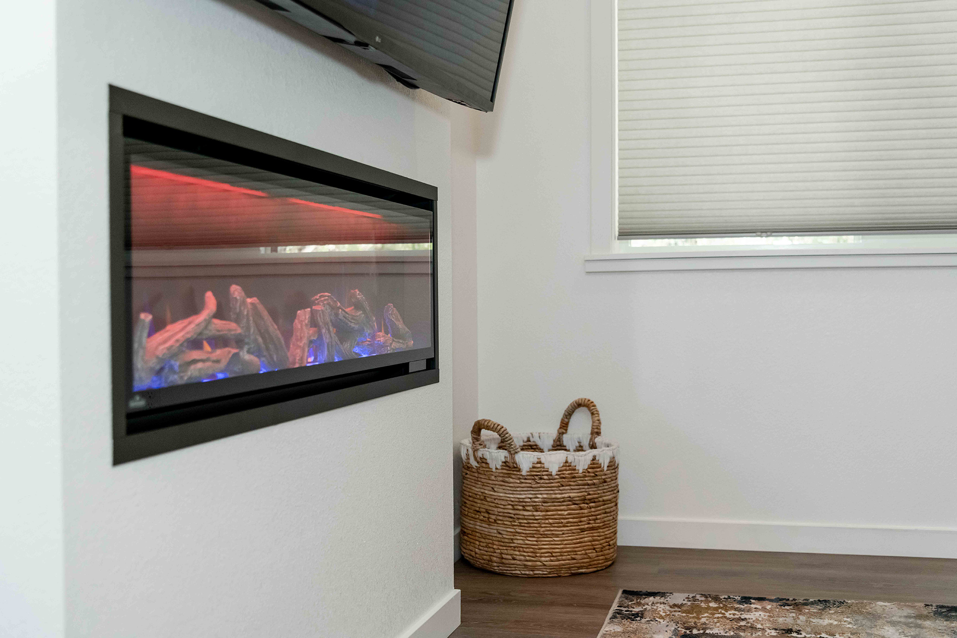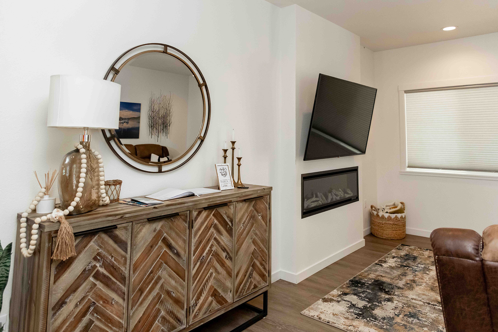 - Open-concept living space with fireplace, Smart TV, and dining area